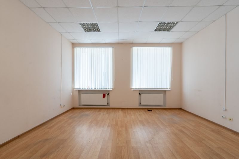 Отделка: потолок типа "Армстронг", пол - ламинат, стены - окрашенные обои, окна с видом на внутренний двор.