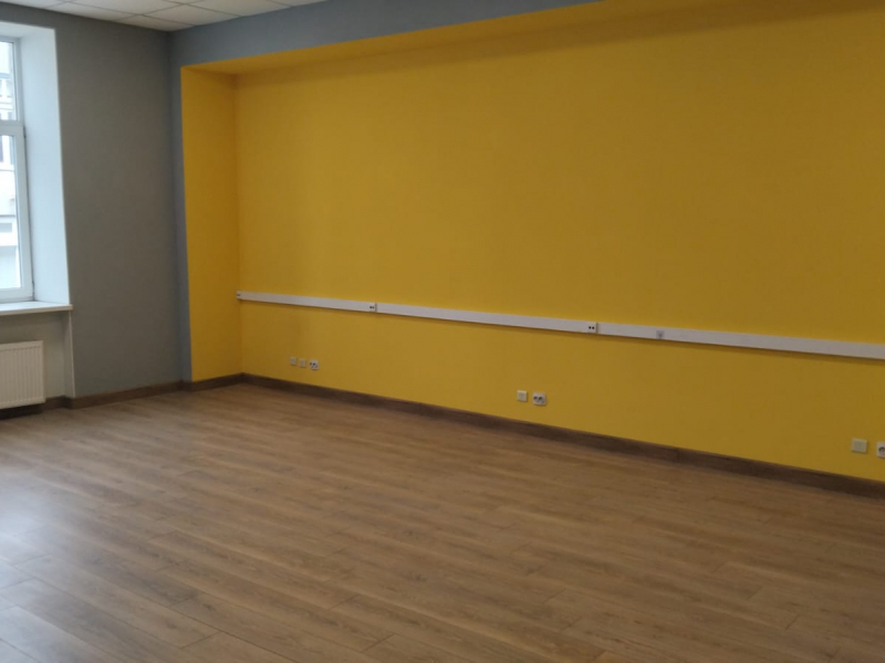 3)Отделка: на полу — ламинат, стены — окрашенные обои, потолок — подвесной.