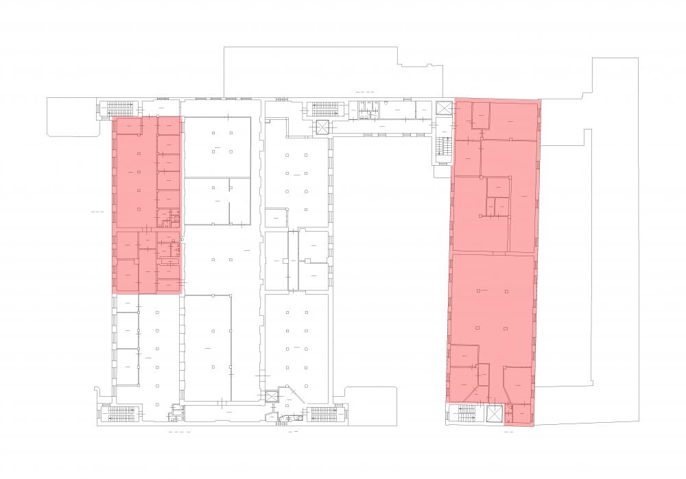 Внутри высокие потолки (3,37 - 3,89 м), окрашенные стены, бетонный пол/кафель, имеются санузлы.