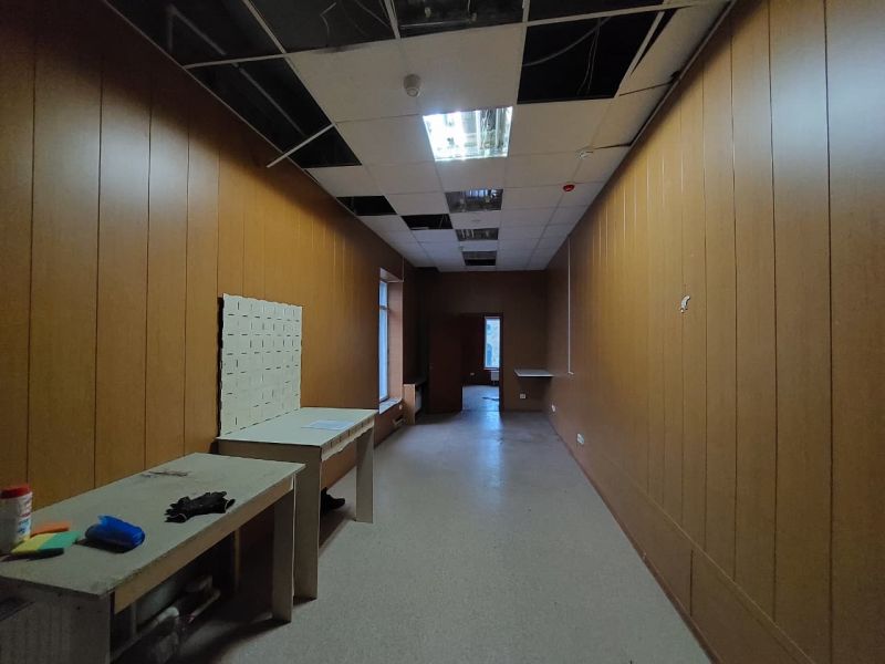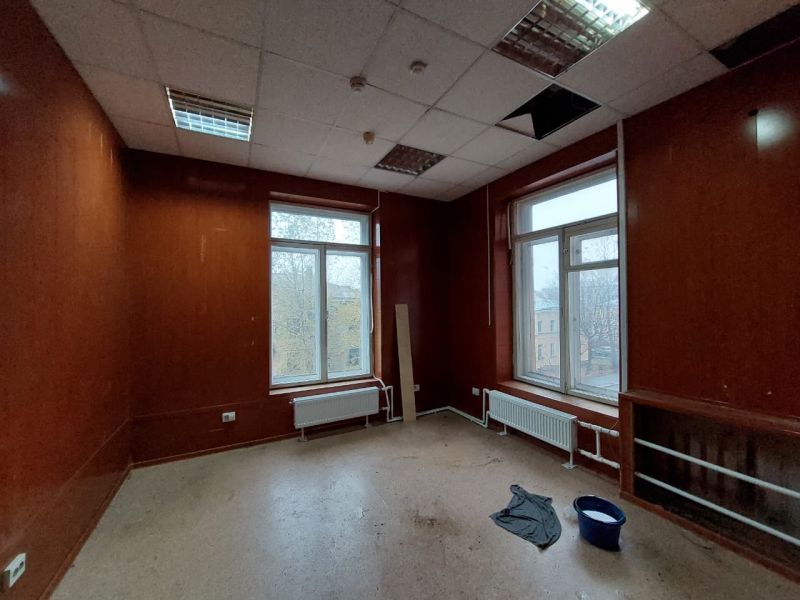 В мастерской установлены большие окна, панели на стенах, линолеум на полу, подвесной потолок.